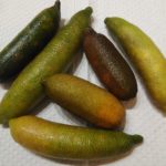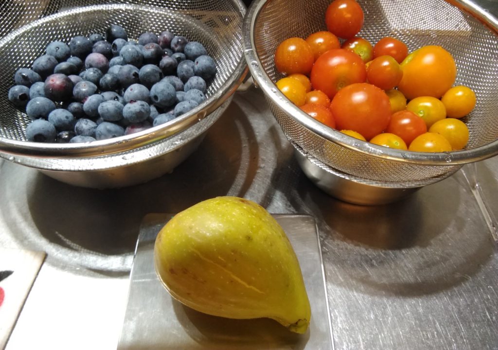果実に触ると少し柔らかくなっていたので収穫。ブルーベリーやトマトと比べるとこの大きさです。↓