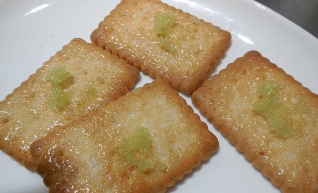 ↑中のつぶつぶを押し出して、ビスケットにのっけて食べます。