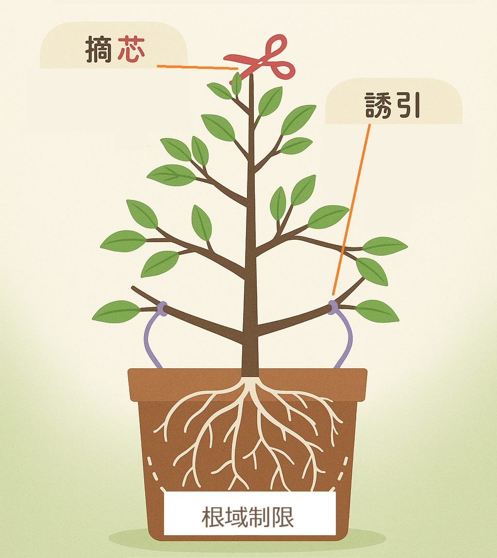 また、果樹の枝を横に誘引することで、盆栽風の枝ぶりにすることもできます。