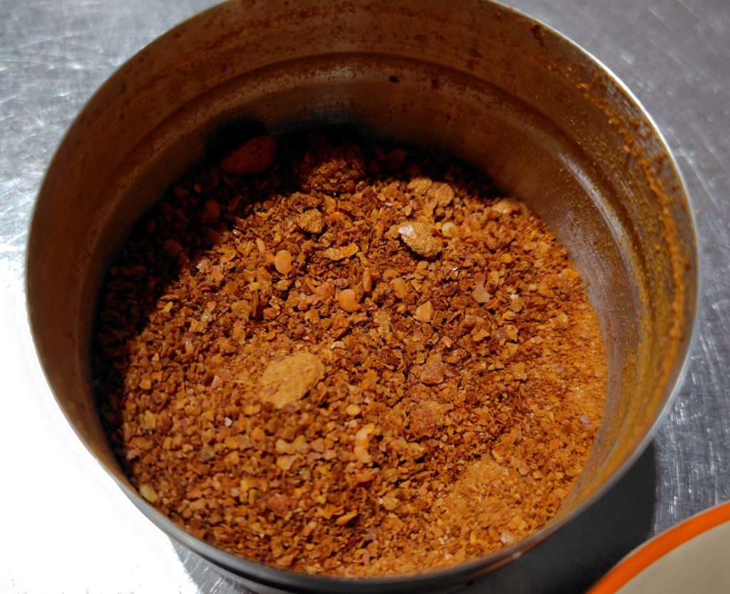 乾燥した唐辛子のへた部分だけはずして、電動ミルに入れます。