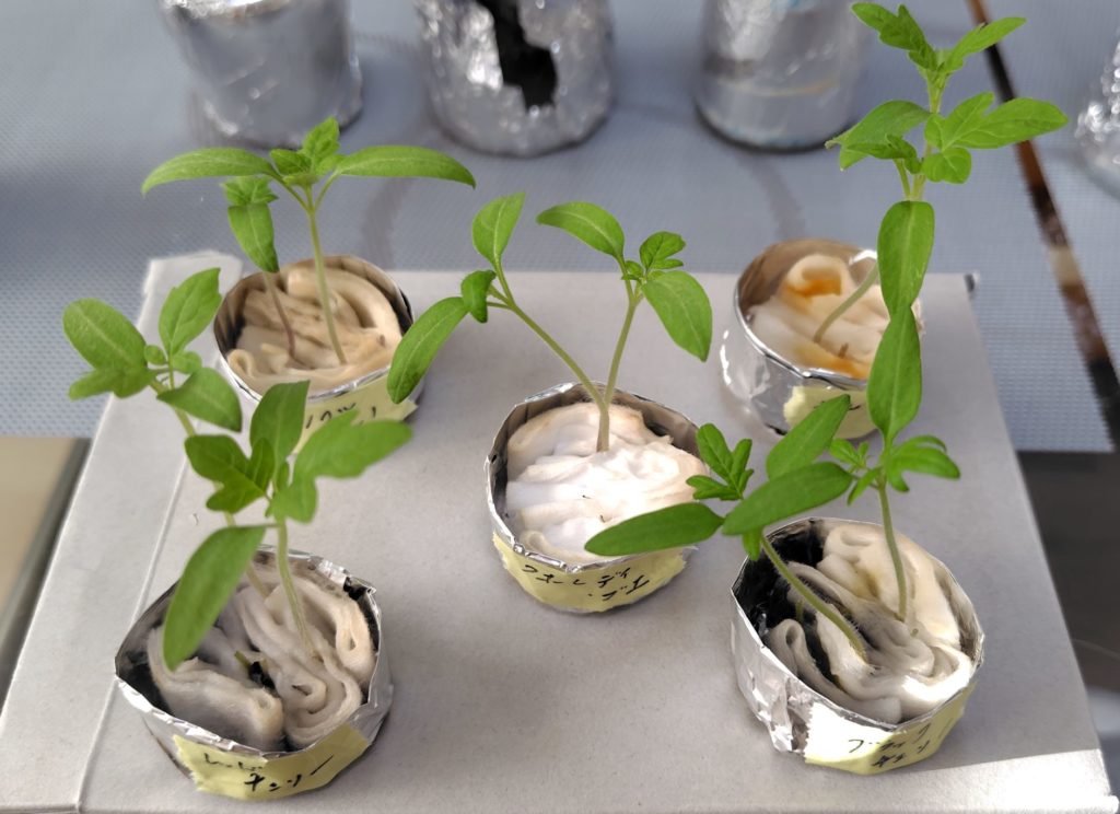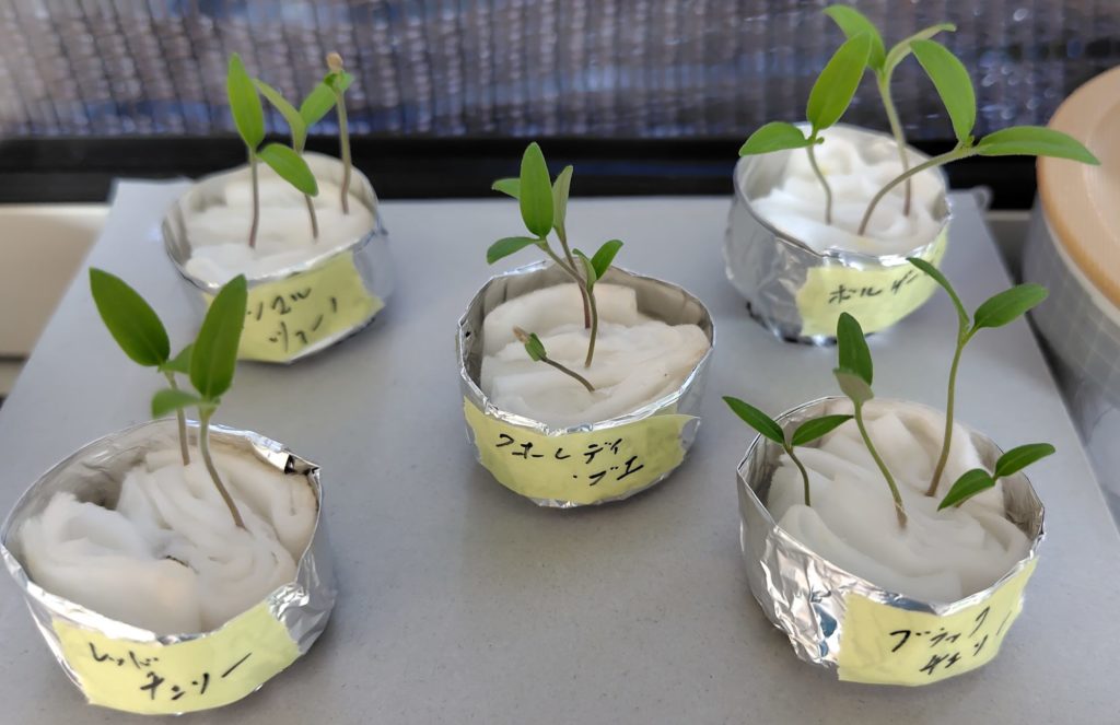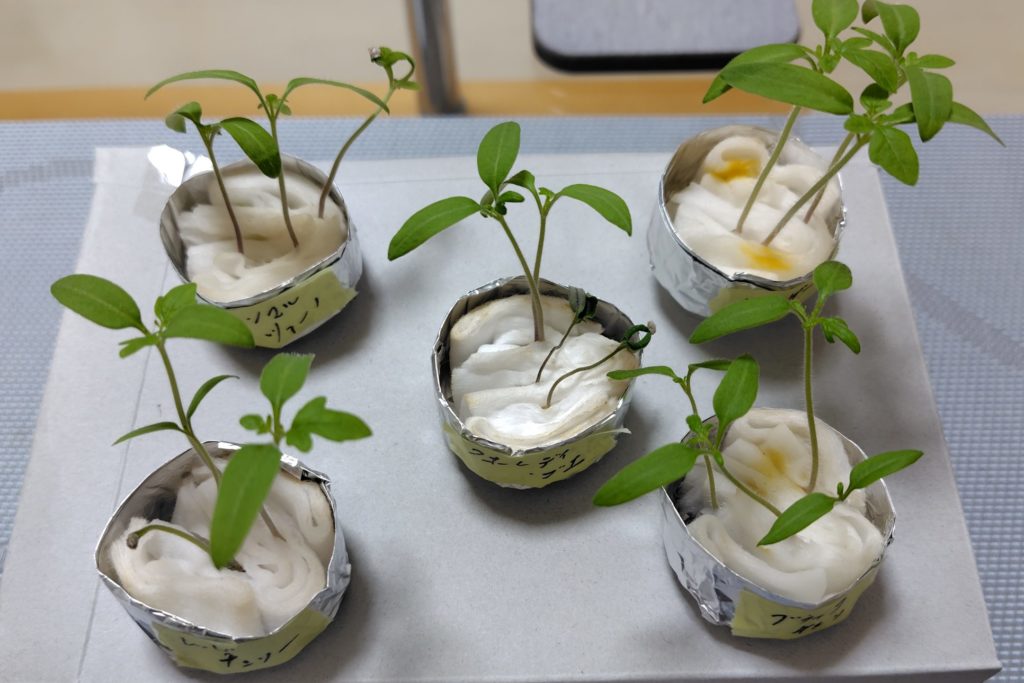 そろそろ5品種まとめて育てるのが手狭になってきたので、それぞれ小さな容器にミニ鉢(アルミホイル鉢)を移動させました。