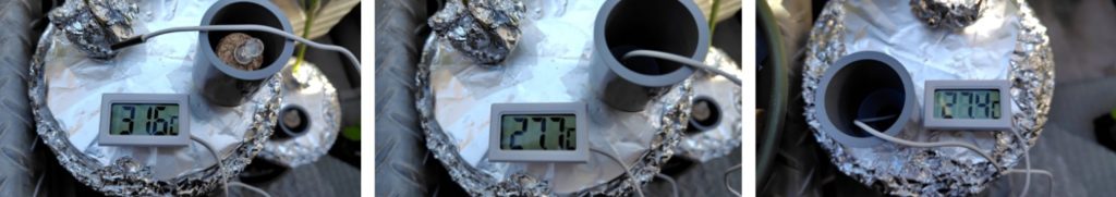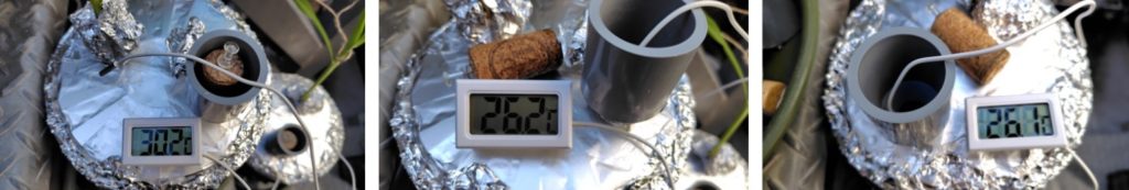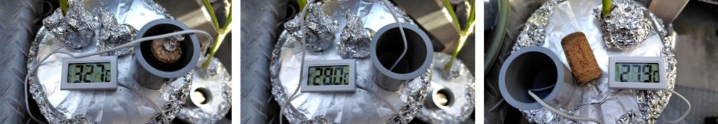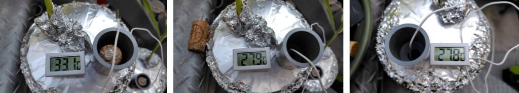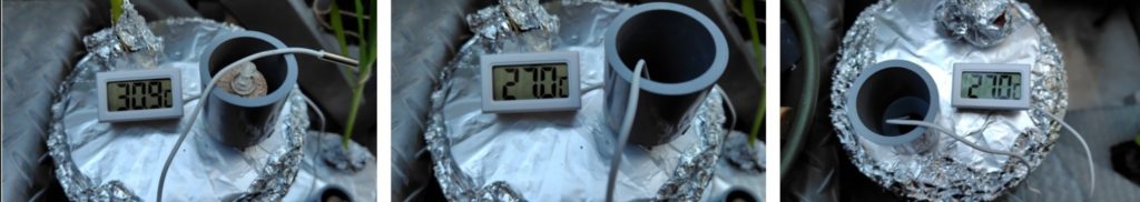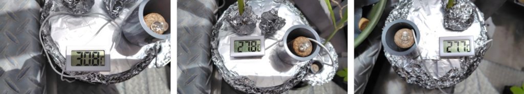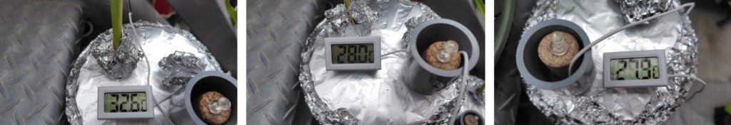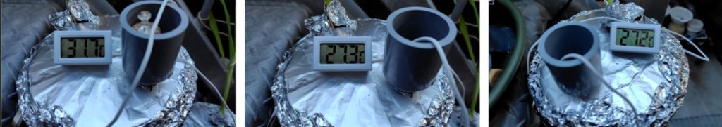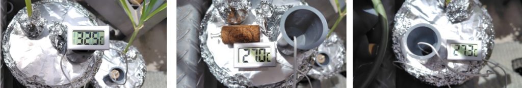 (気化熱を利用して水温が下がっているかの計測です。容器の下の受け皿の水が容器の側面に巻いたフェルトに伝わり、フェルトから蒸発するときに熱をうばって冷やすという方法で、水温はどうなっている確認するものです。)