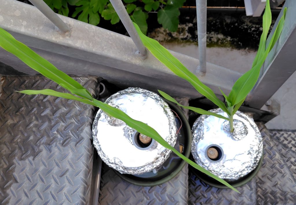 7月19日が晴天だったのと、この日の朝、白とうもろこしの小さな苗を、屋外の階段に設置した中型容器に移したので、容器内の水温が気になって計測した結果の報告になります。