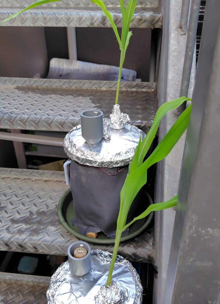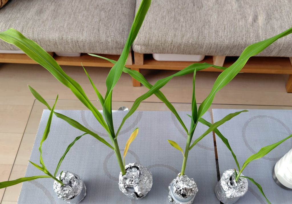 間引いて別の瓶で栽培を続けている白トウモロコシは、大きいものの半分程度の大きさです。