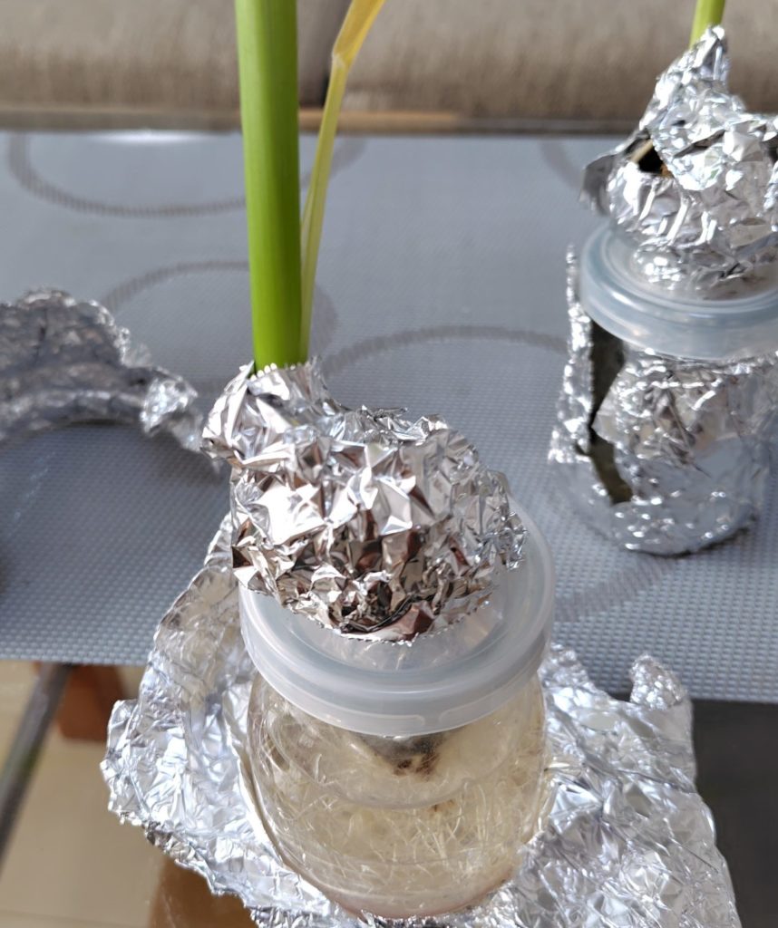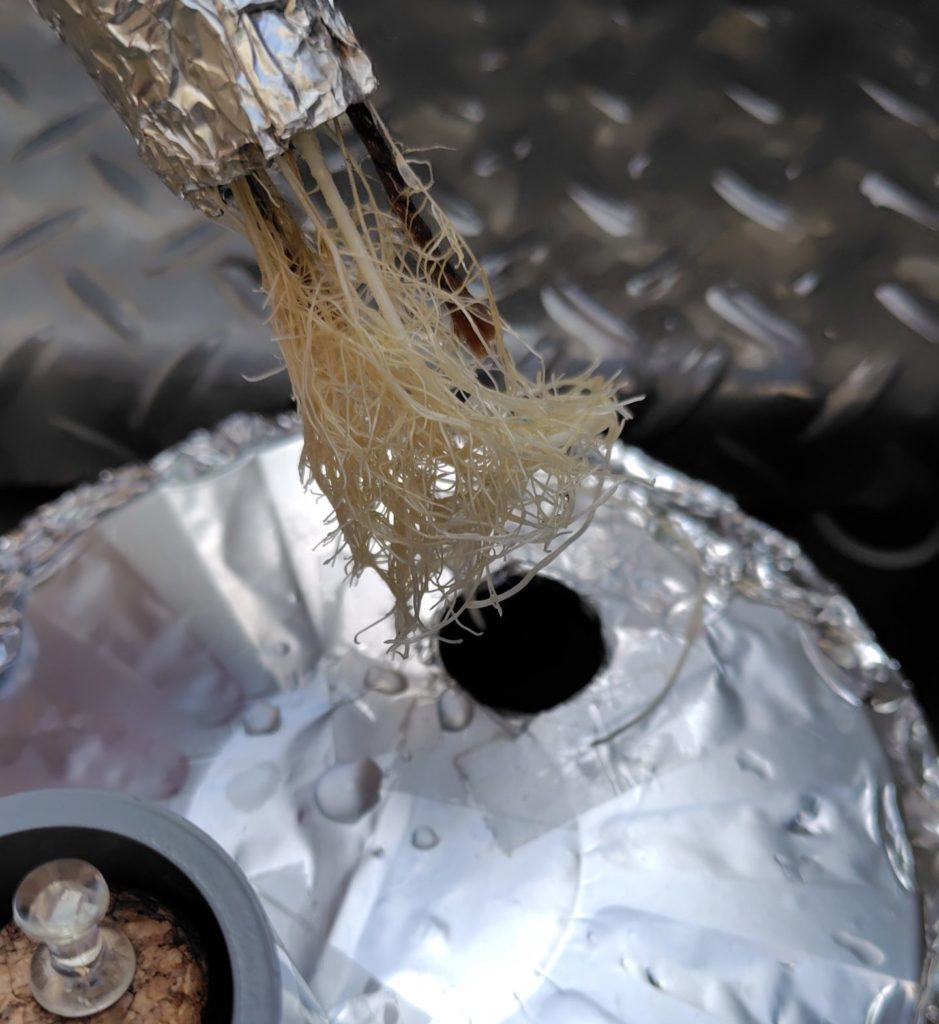 屋外の中型容器の穴に根とアルミホイルミニ鉢をつっこみます。↓