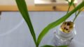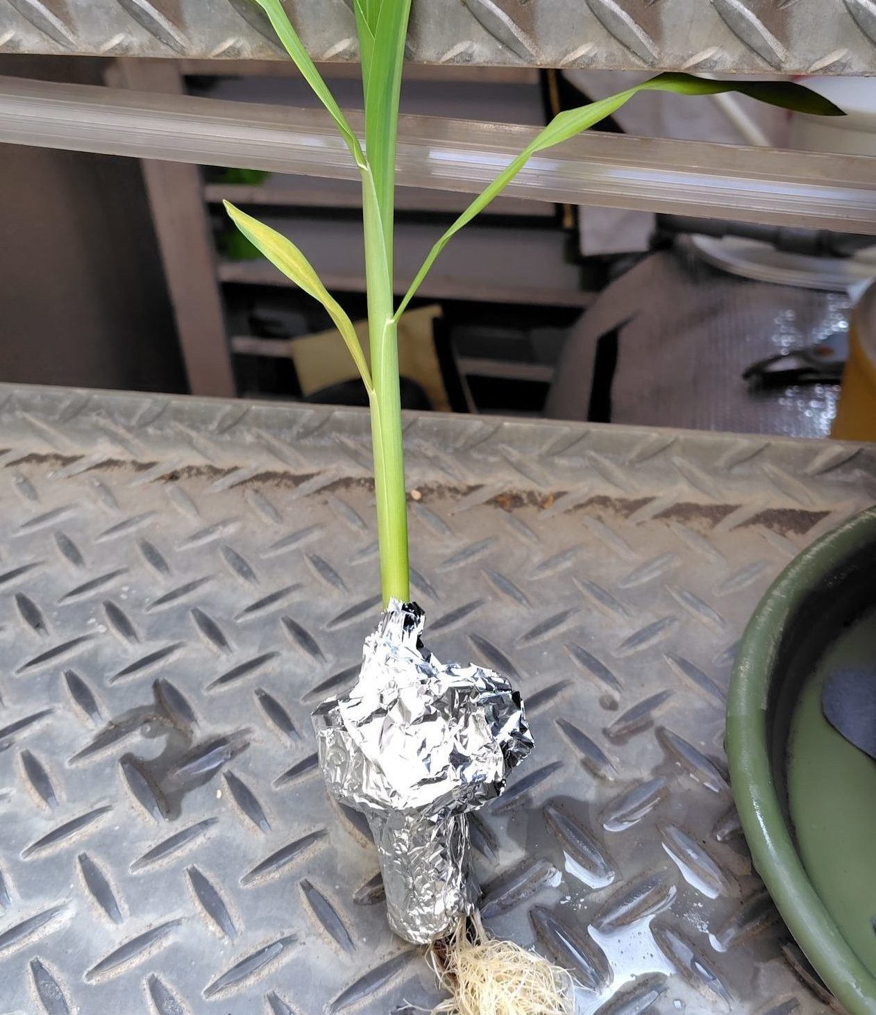 間引いて別の瓶で栽培を続けている白トウモロコシは、大きいものの半分程度の大きさです。