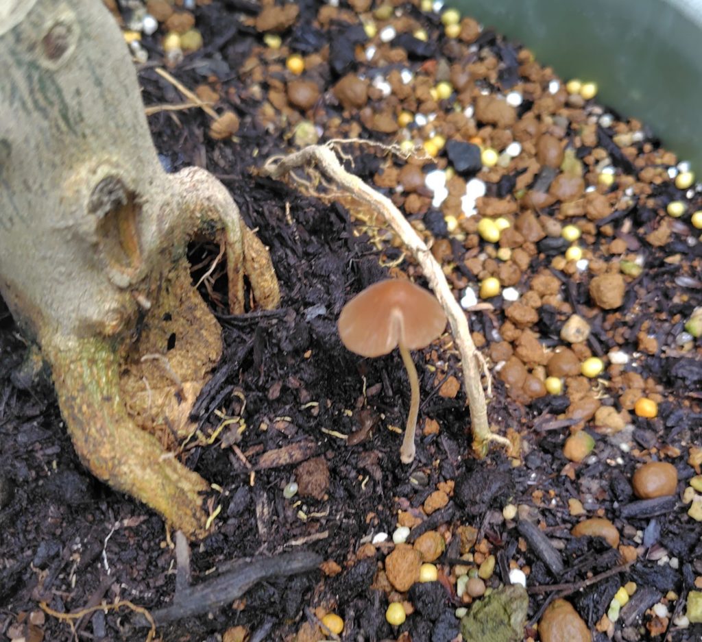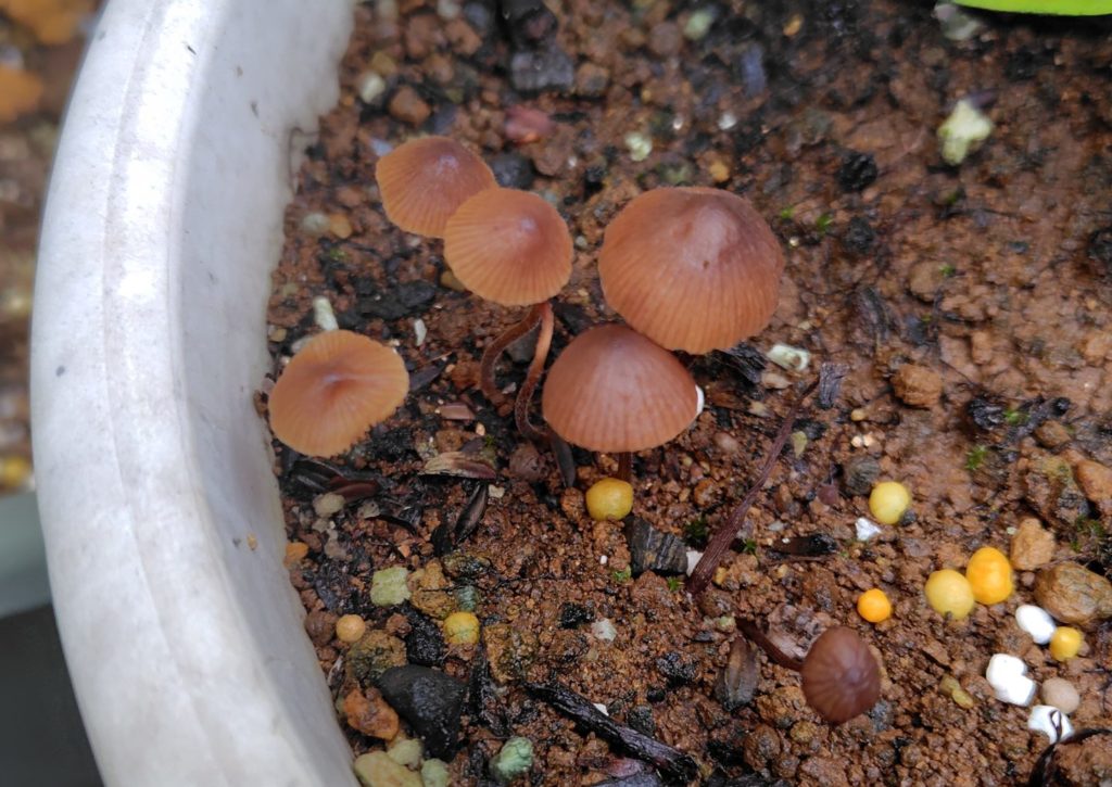柑橘の「じゃばら」を植えている鉢から、よく生えてくるキノコです。