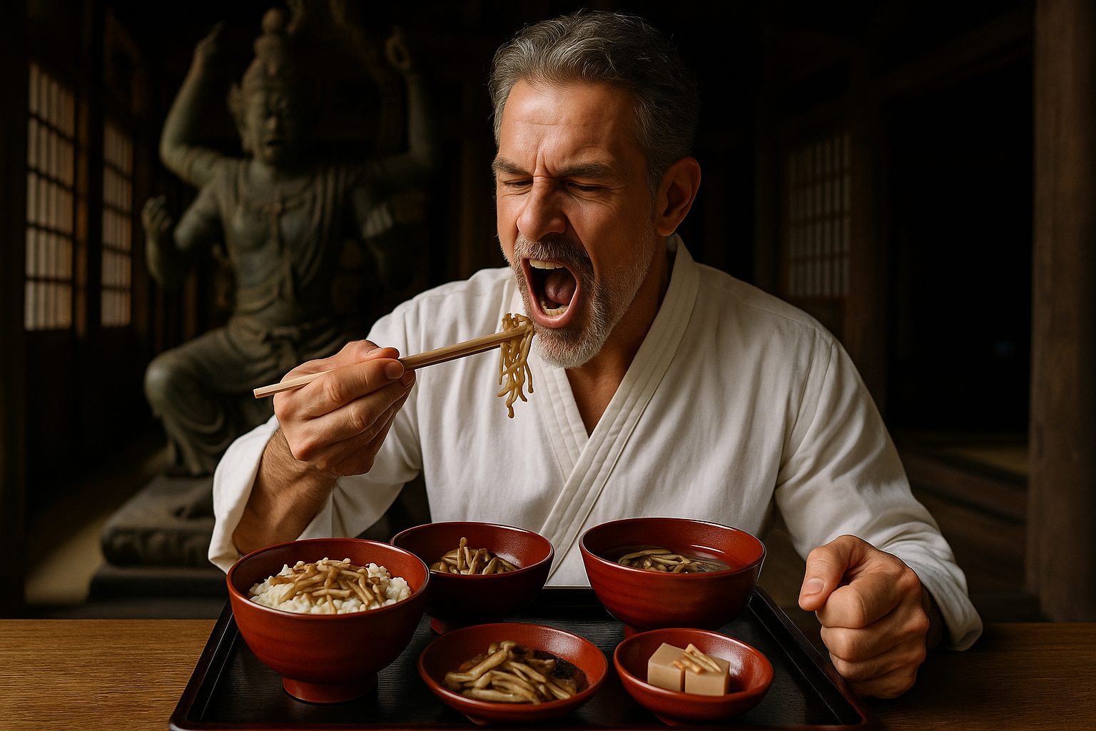 (↑ 黄小傘茸の精進料理を気合で食べようとしている男性のイメージ写真)