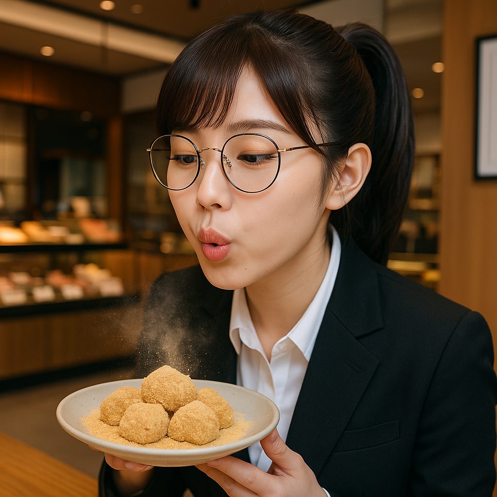(↑ 粉を吹き飛ばしている眼鏡をかけた女性のイメージ)