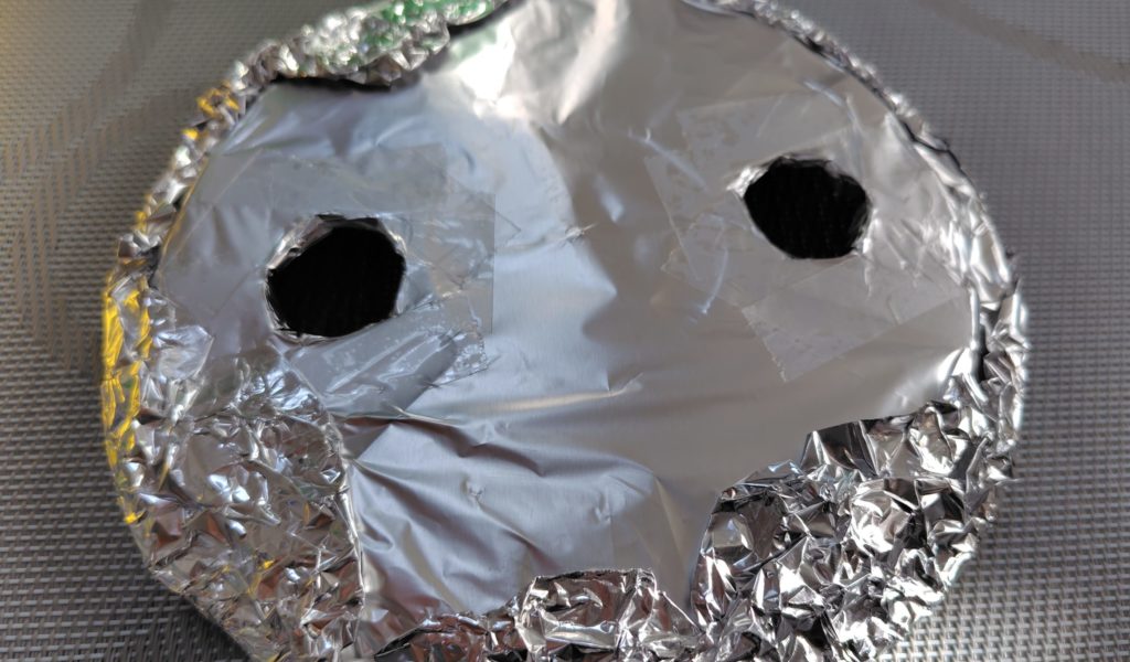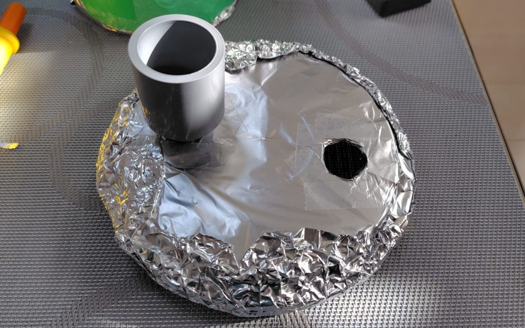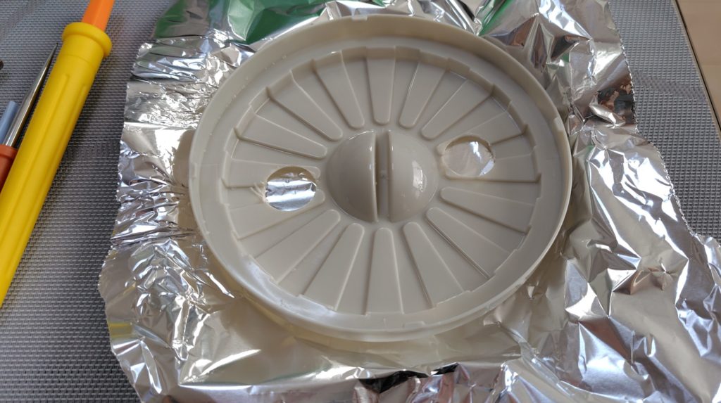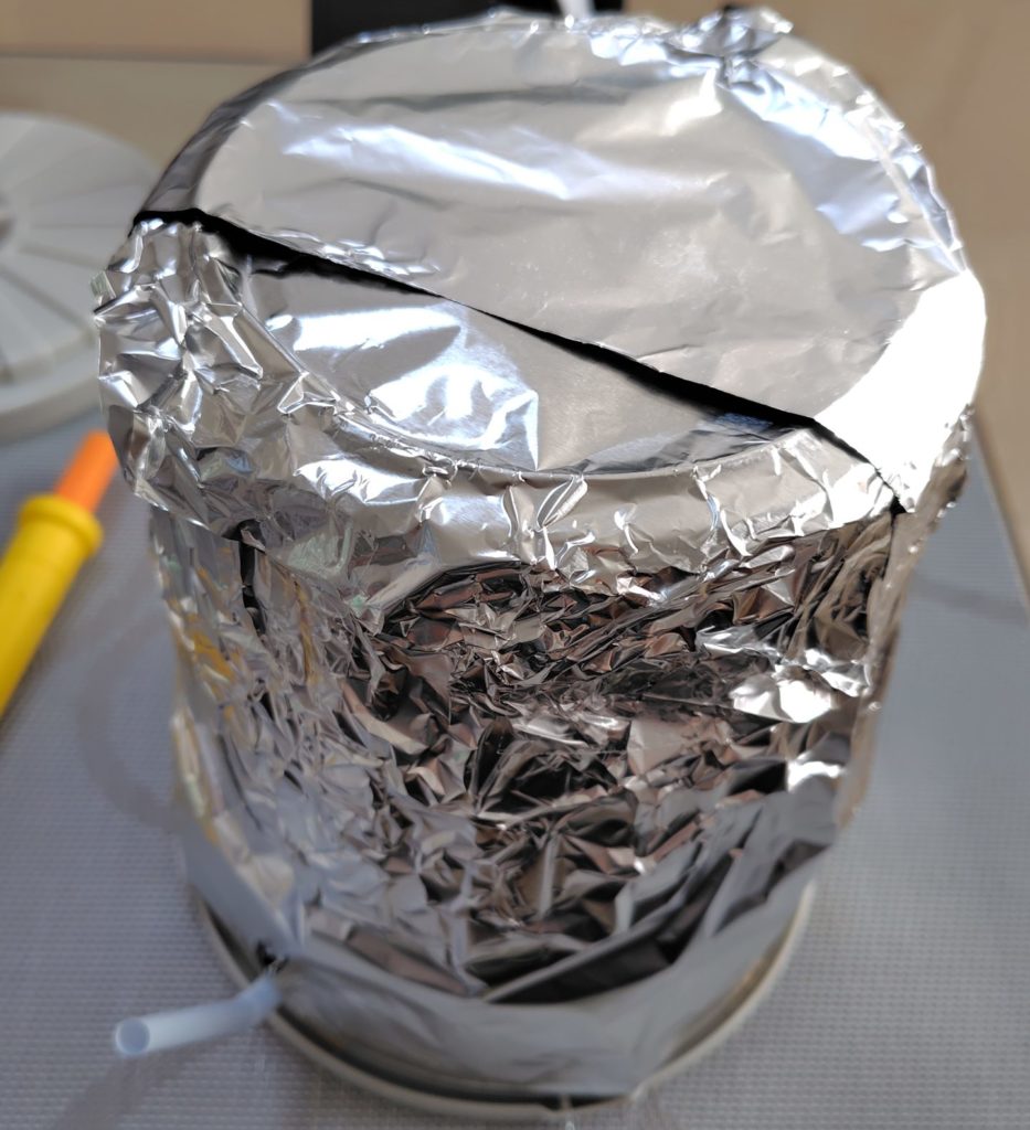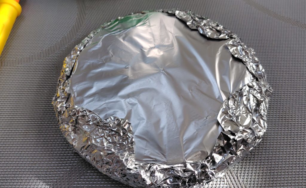 両面テープを蓋の側面などにつけ、蓋の外側にアルミホイルをつけます。