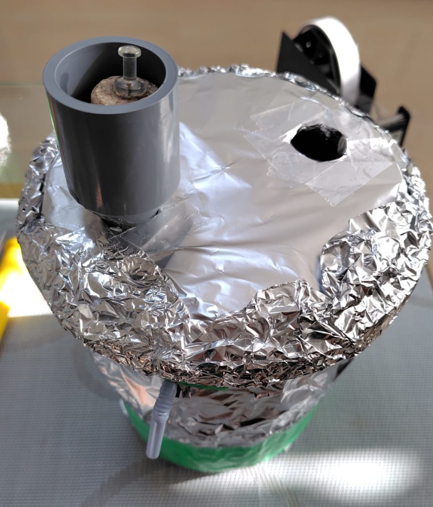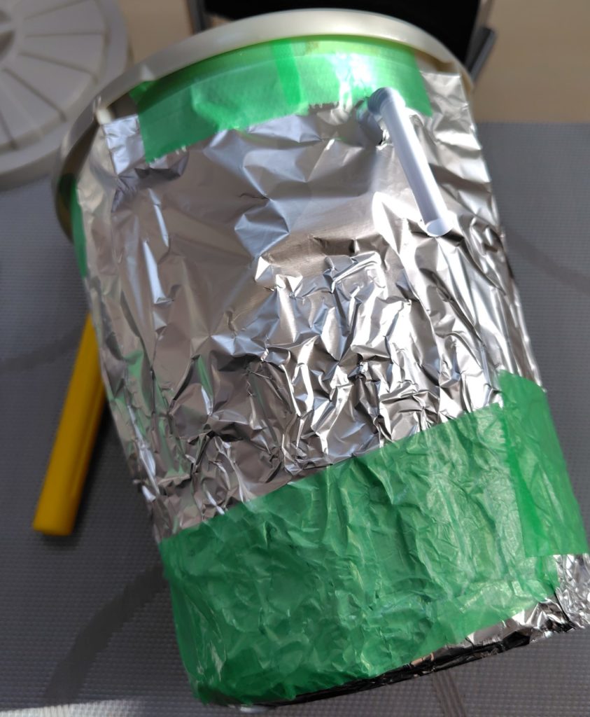 蓋つきバケツ(容量2リットルくらい)、アルミホイル、ストロー、コルク、押しピン、塩ビパイプの異径ソケット