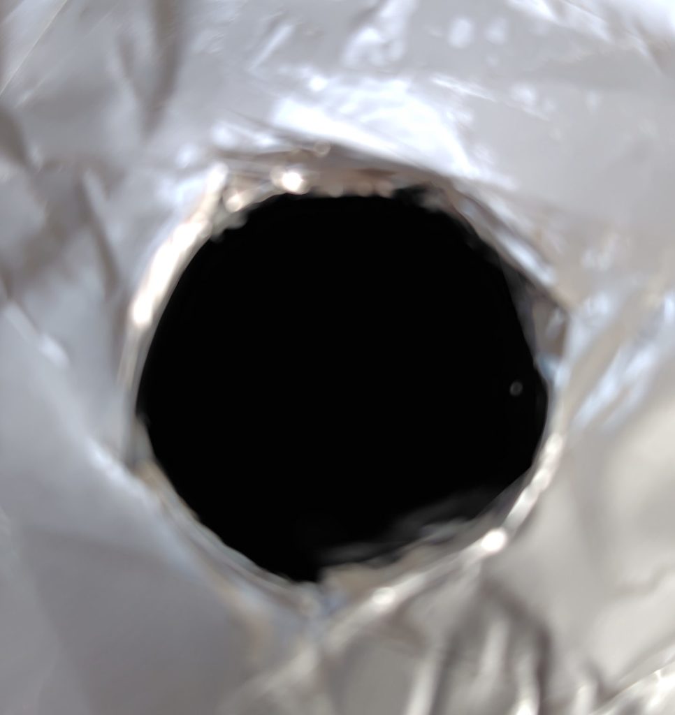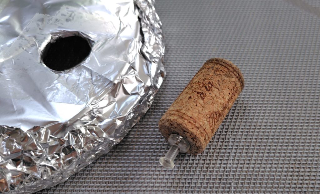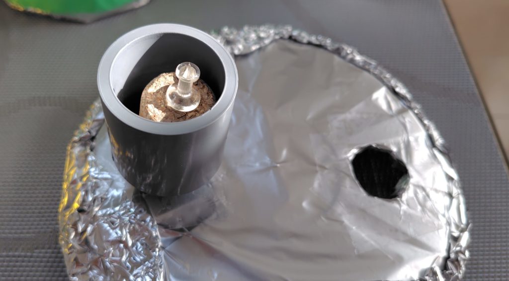 蓋の最初に開けた穴にあわせて、アルミホイルにも穴をあけます。
