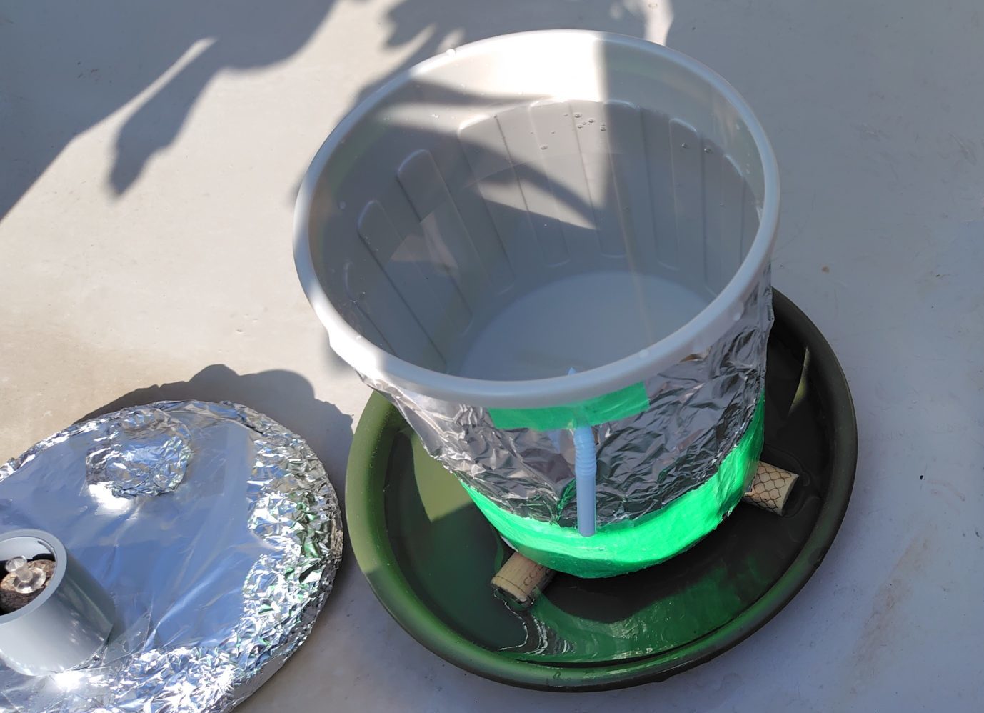 蓋つきバケツ(容量2リットルくらい)、アルミホイル、ストロー、コルク、押しピン、塩ビパイプの異径ソケット