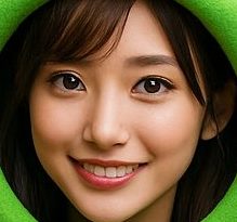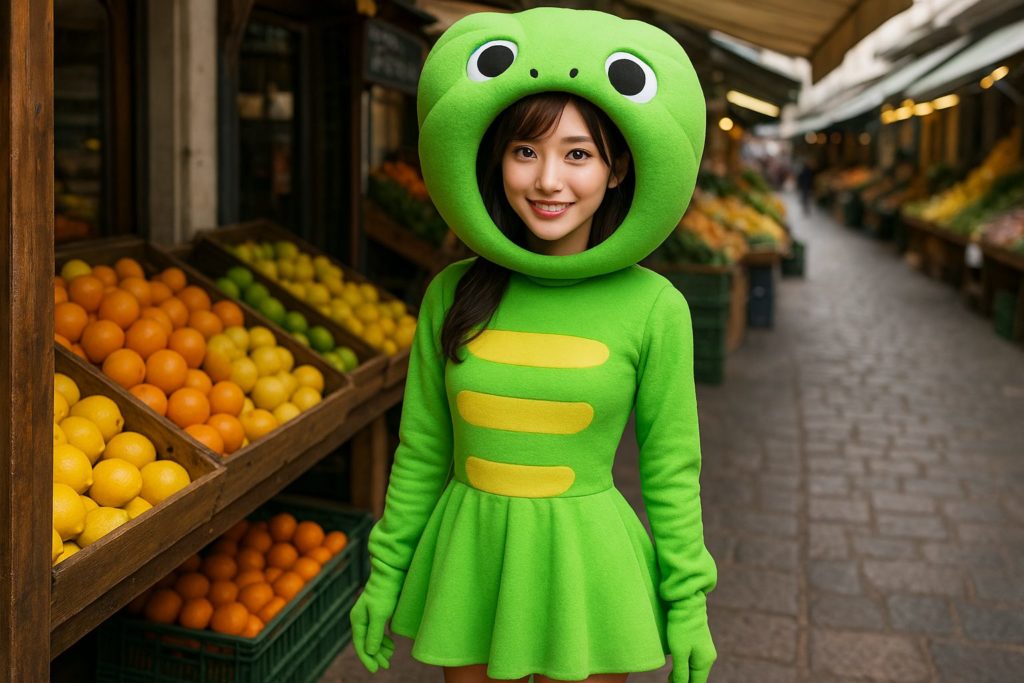 (↑ 柑橘をねらっているガチャピンのふりをした女性のイメージ写真)