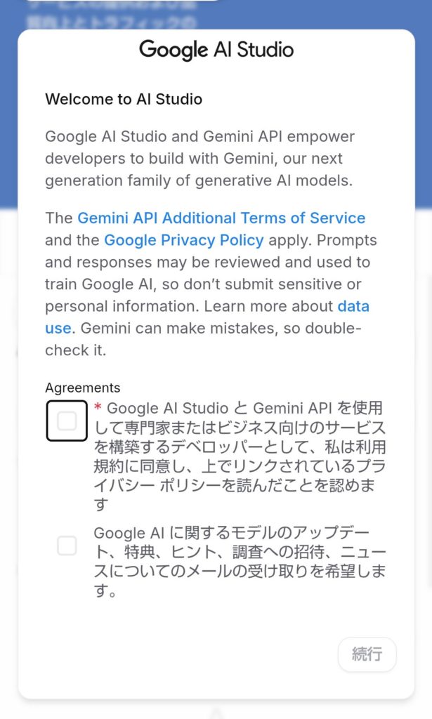 ここでは、利用規約のボックスにチェック(タップ)をして「続行」を押します。